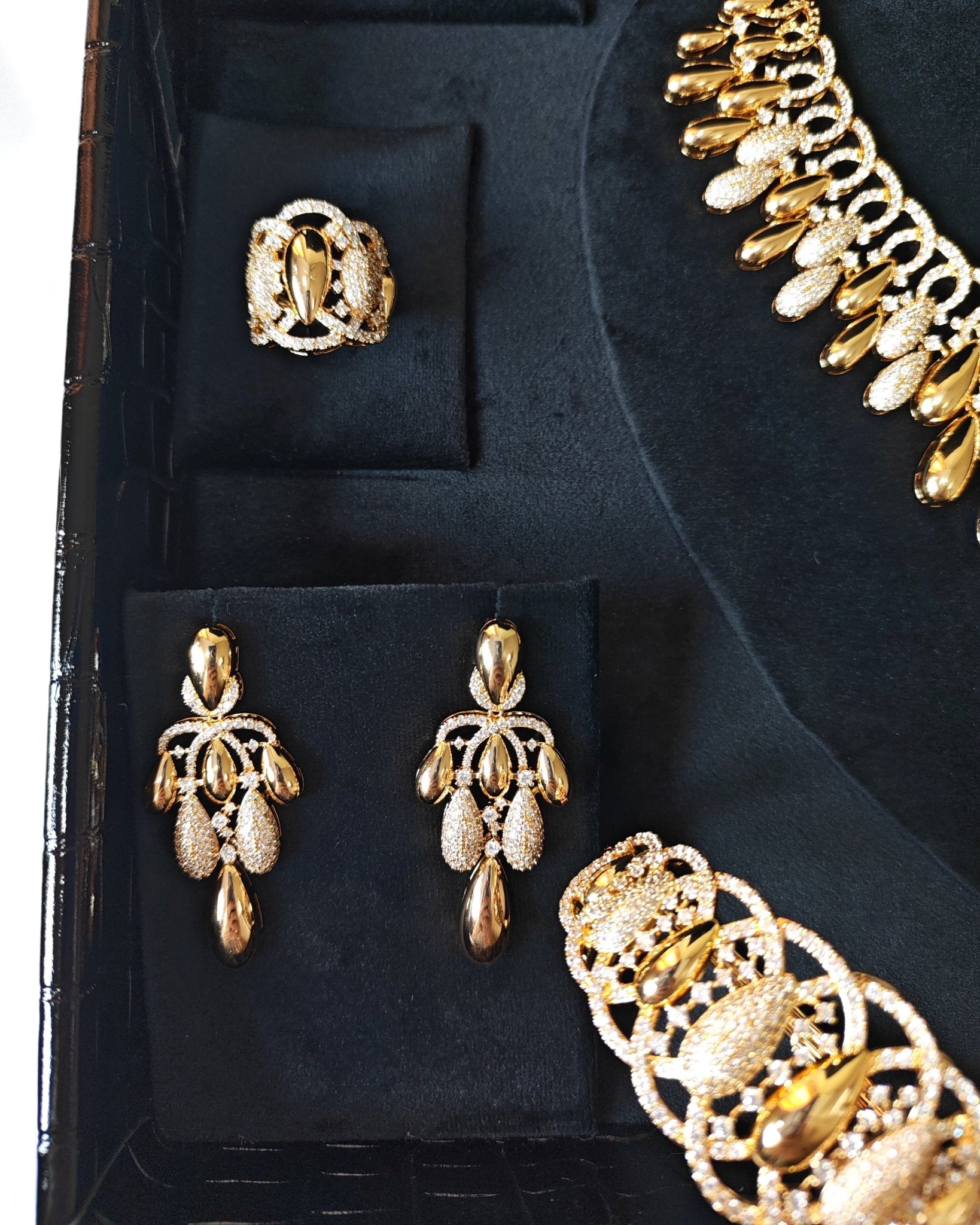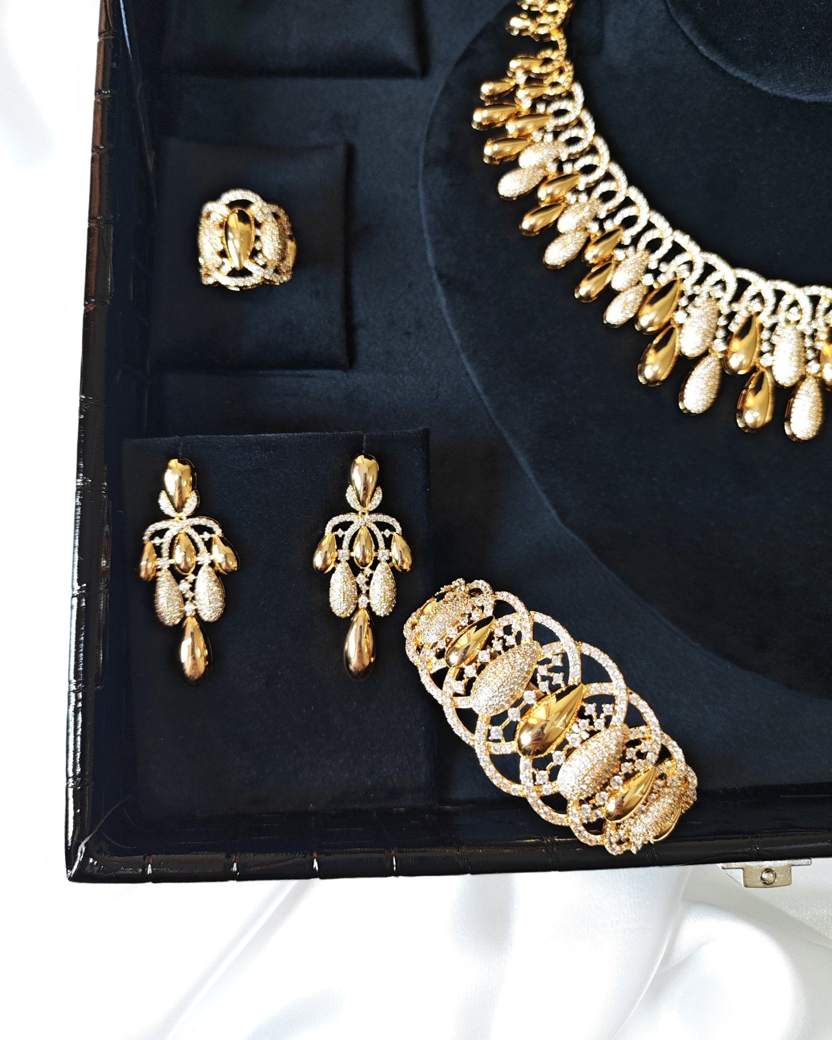 Sparkle like royalty with the Alicia Glamorous Set—a dazzling collection of luxurious golden pieces adorned with shimmering zircons that turn every moment into a red-carpet worthy celebration.
