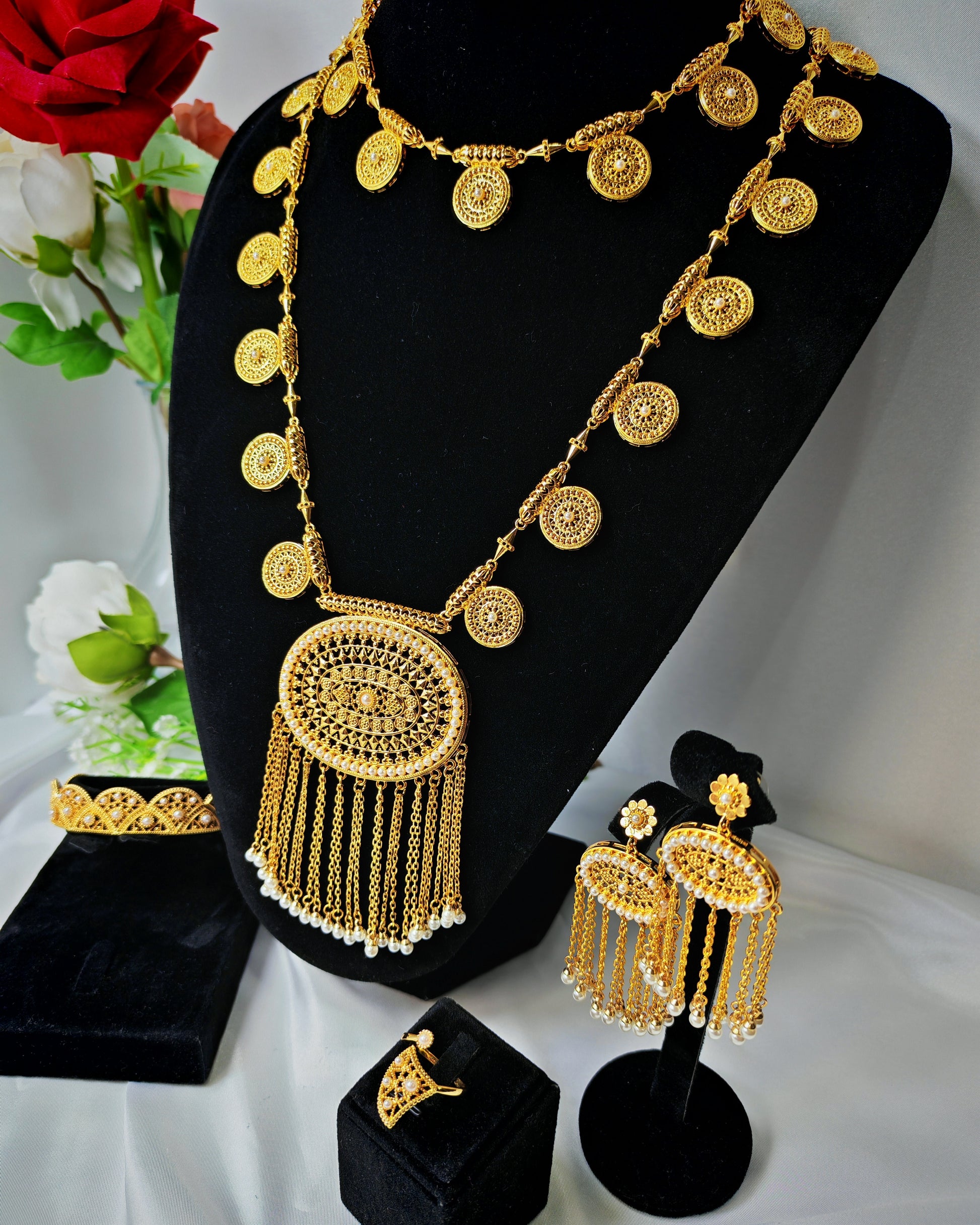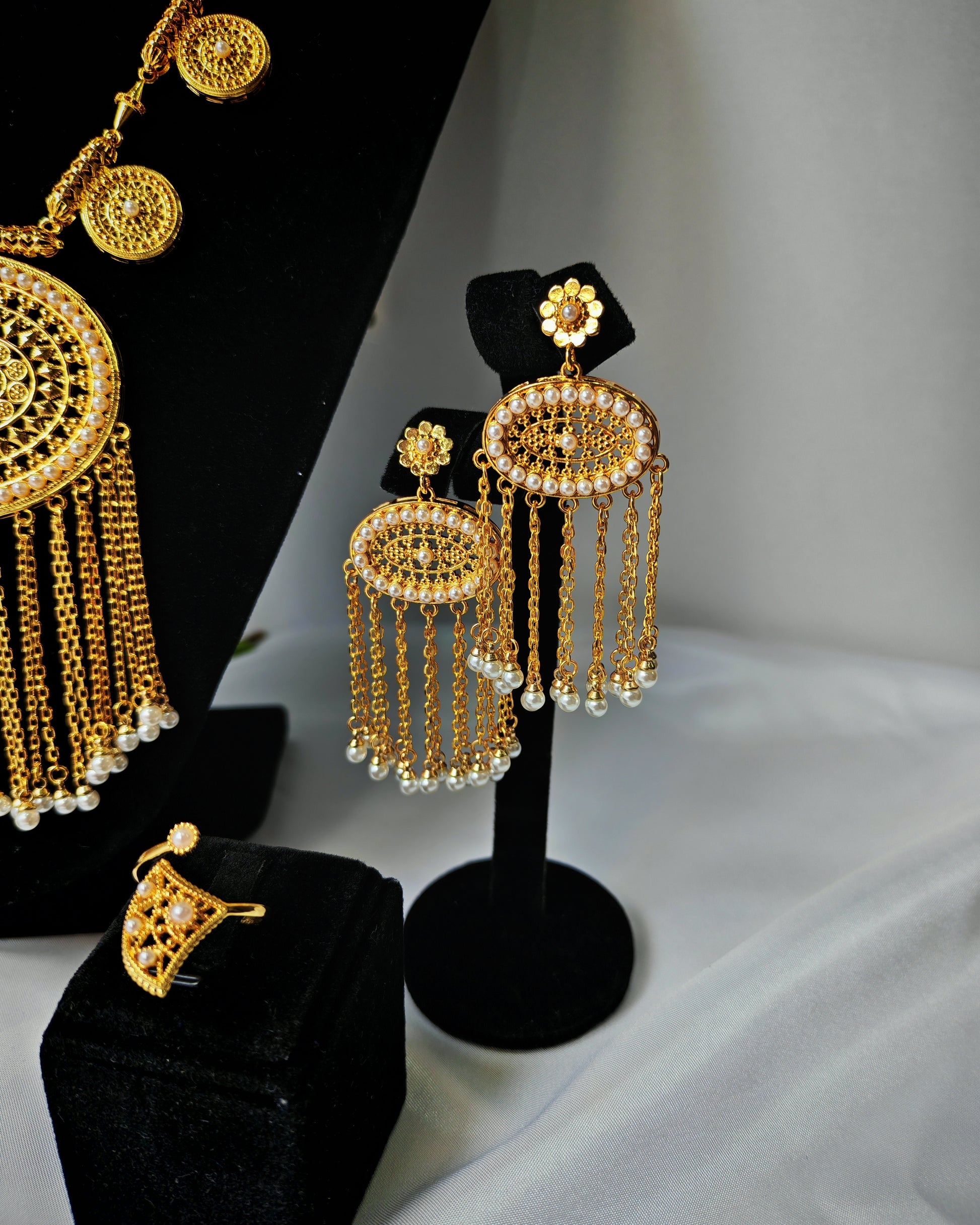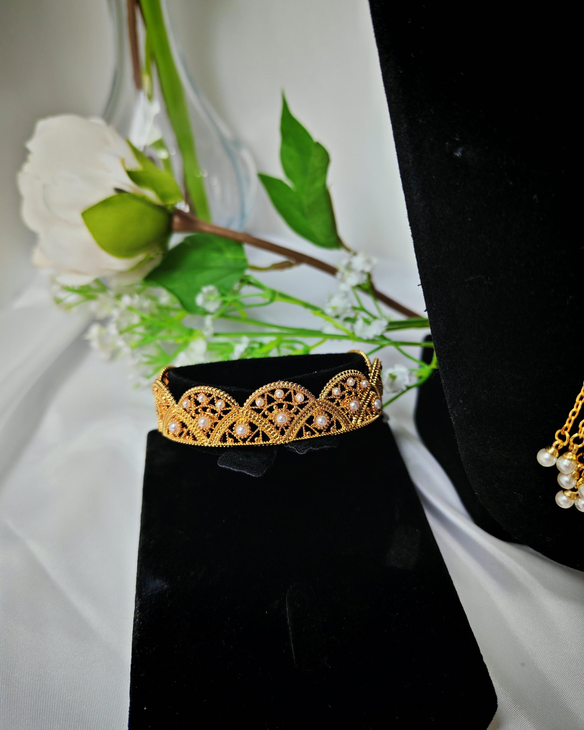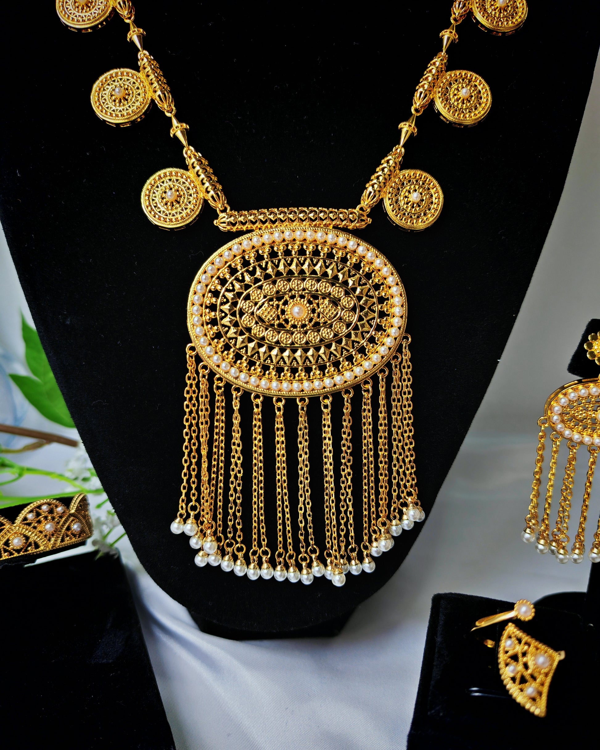 Elegant layered necklace set featuring lustrous pearls in a choker style, combining timeless sophistication with contemporary design for a distinctive, versatile look.