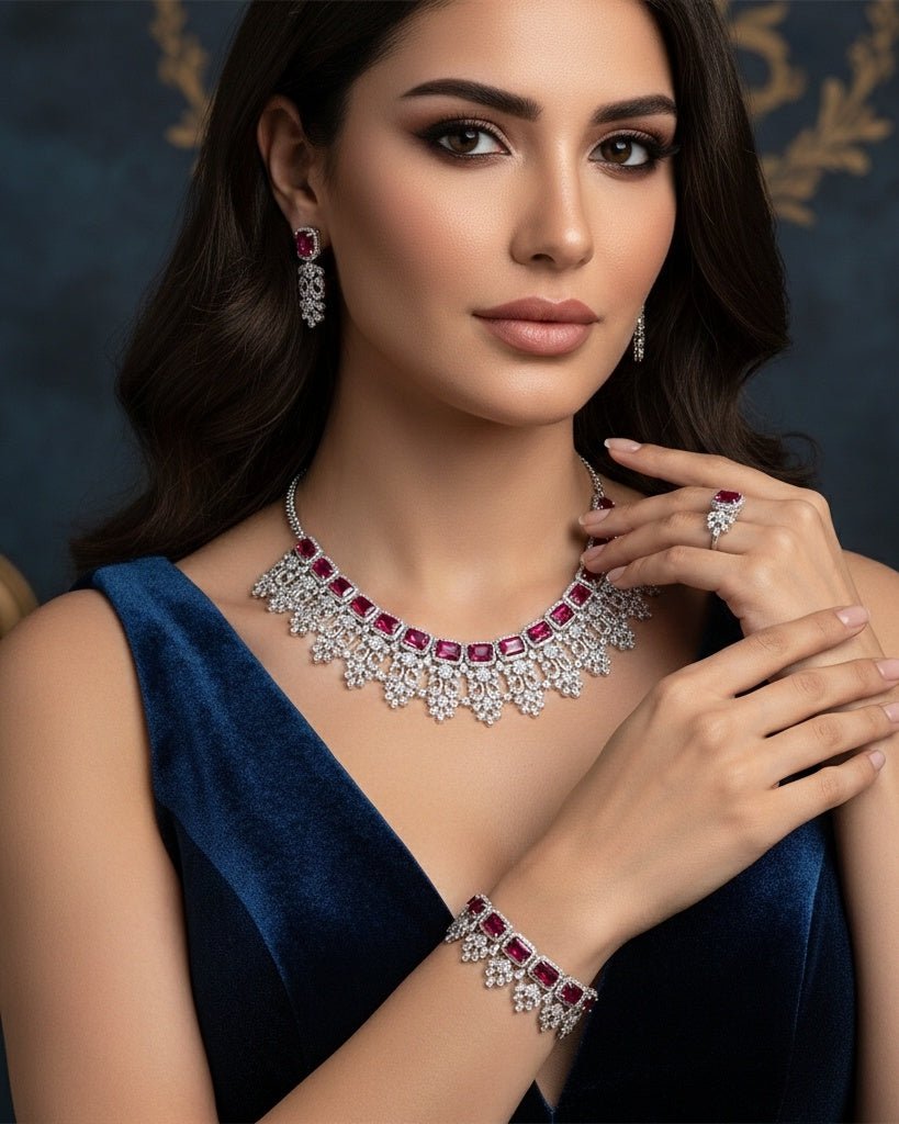 Dazzle in this gorgeous choker set featuring vibrant green and red zircons that sparkle with playful elegance and timeless charm.
