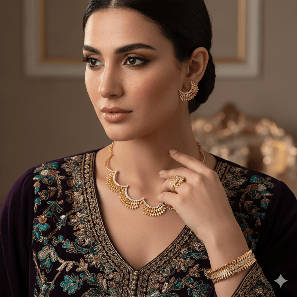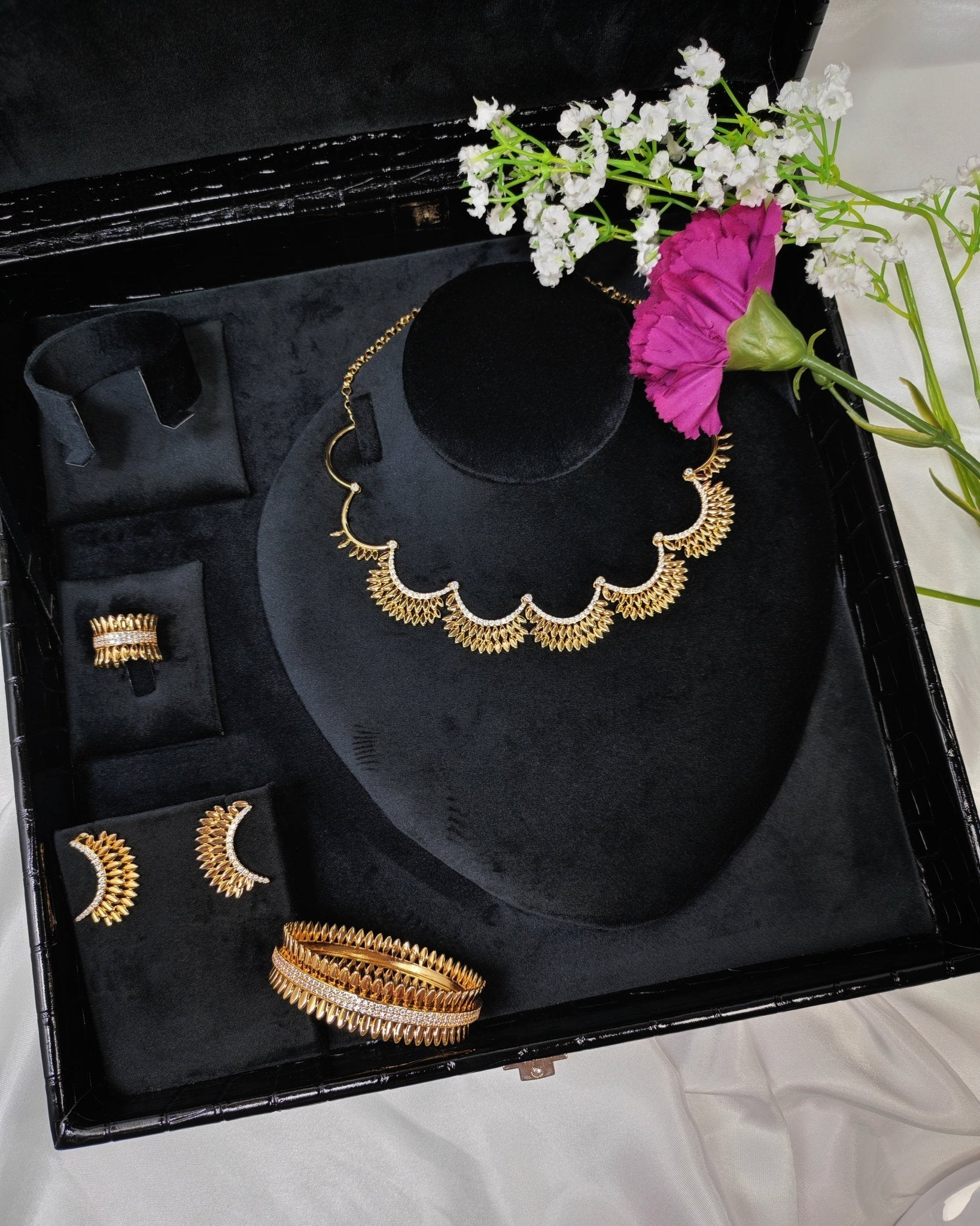 Sparkle in style with this radiant Saint Golden Set, featuring a stunning one-line design adorned with shimmering zircons that catch the light from every angle. Perfect for adding a touch of glamorous elegance to any occasion, this unique piece combines timeless sophistication with modern flair. Let your inner radiance shine through!